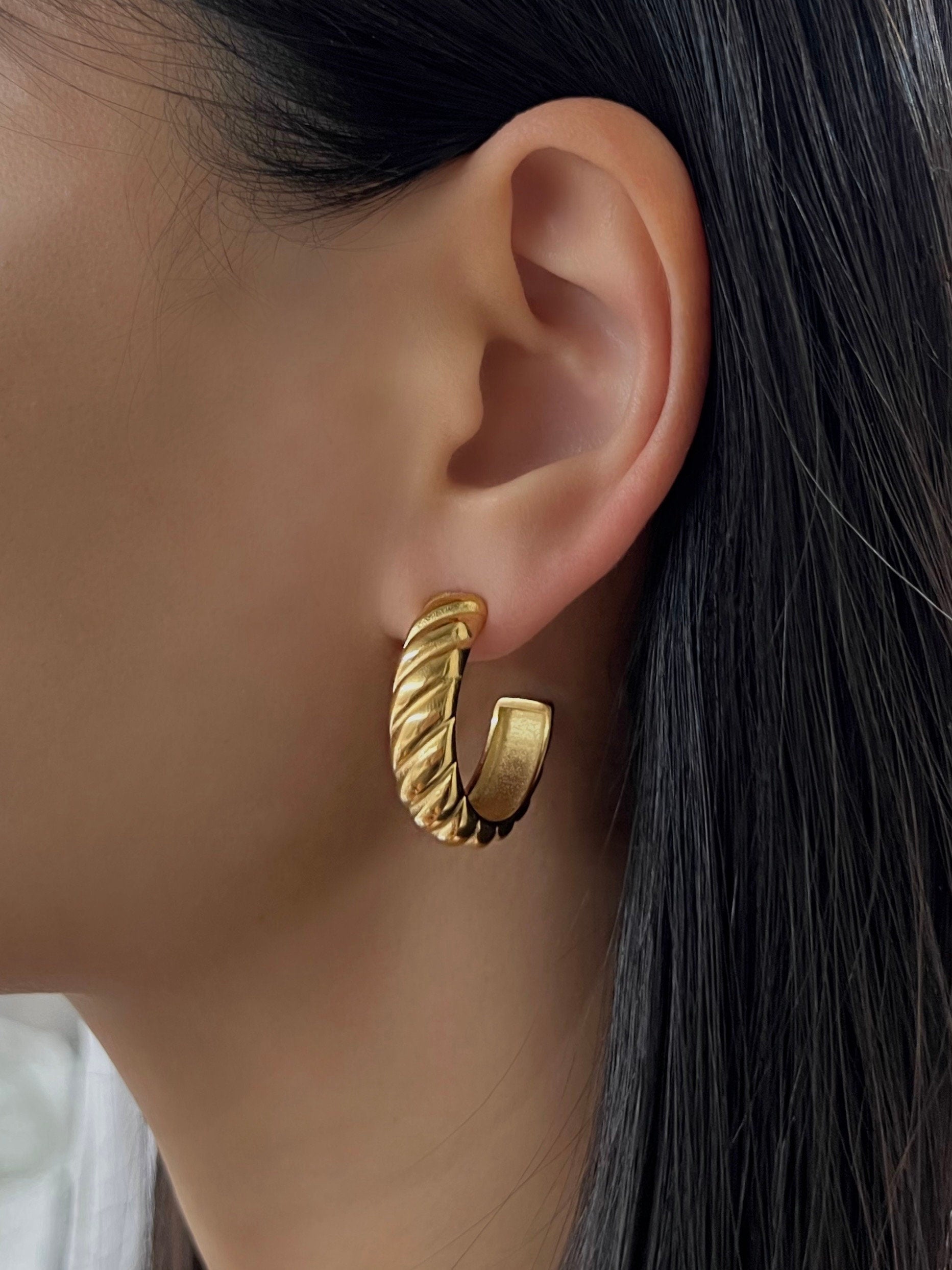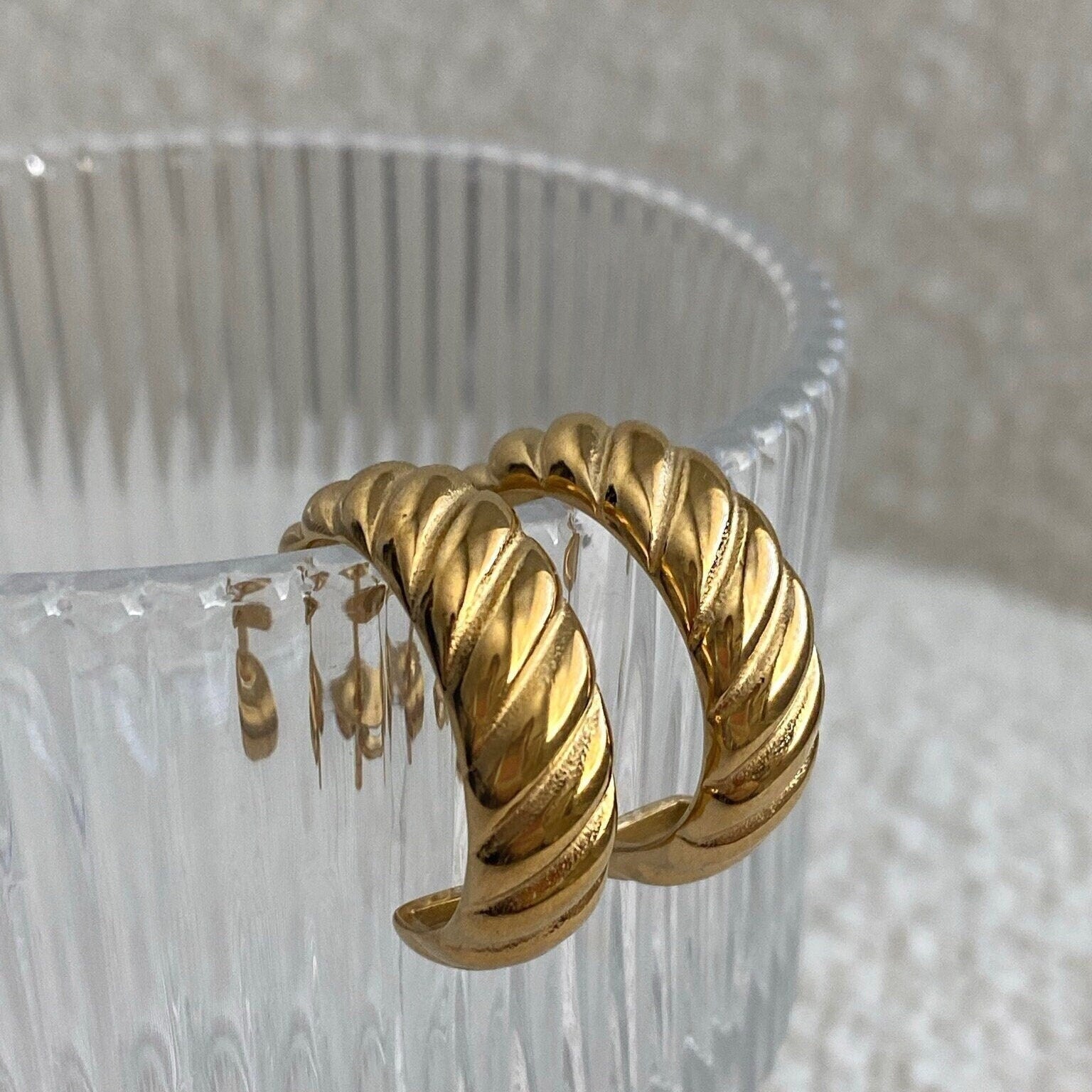Made from stainless steel as the base material and 18K gold filled, these medium-sized croissant hoop earrings make a timeless and trendy fashion statement. Paired perfectly with our thick and chunky croissant ring, these waterproof earrings are a must-have in your jewelry collection.