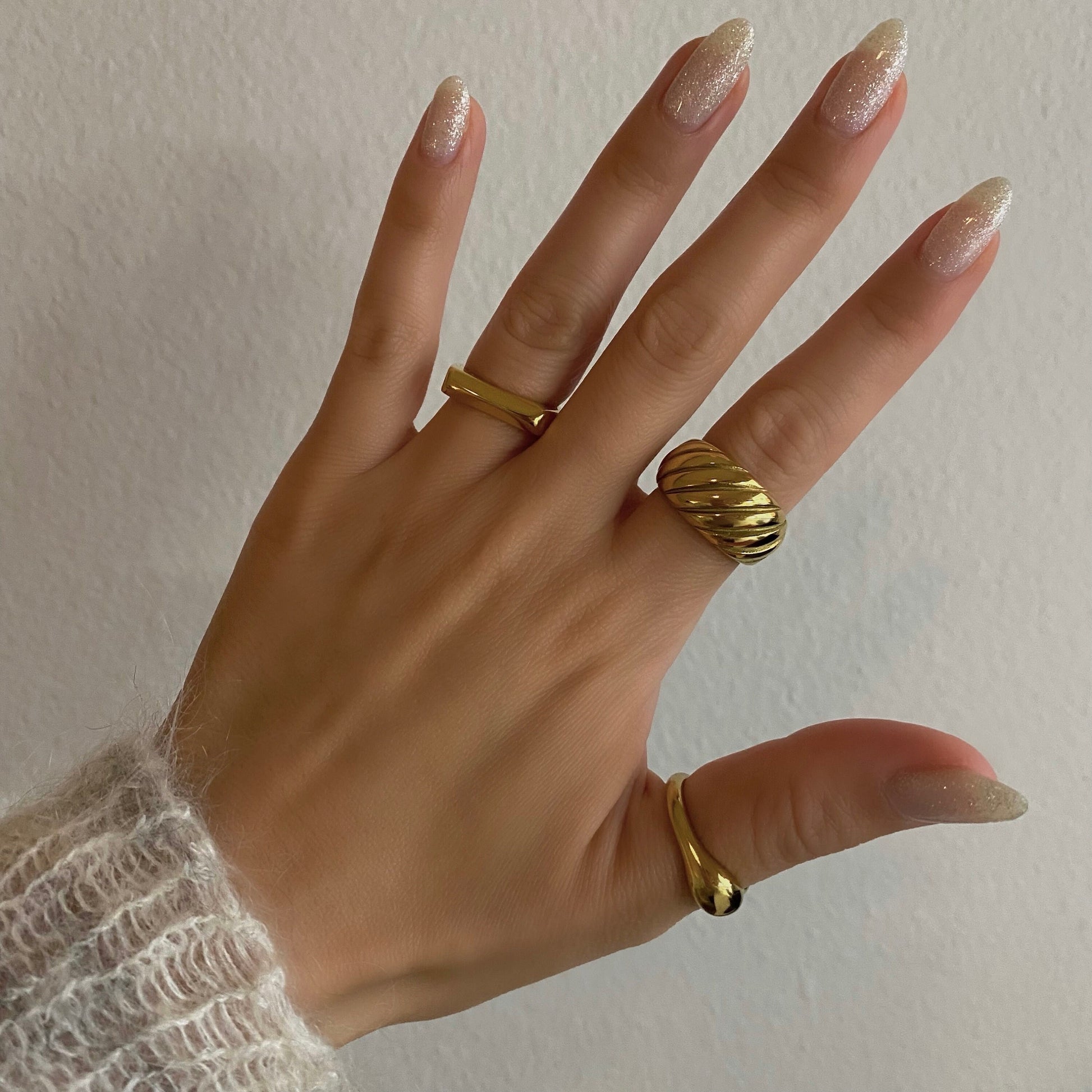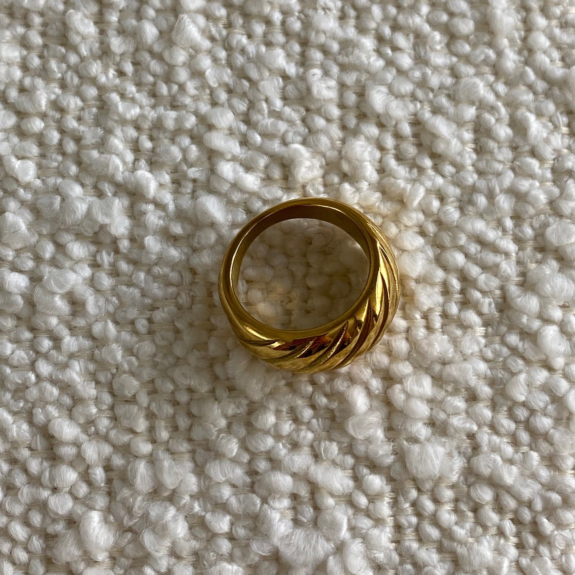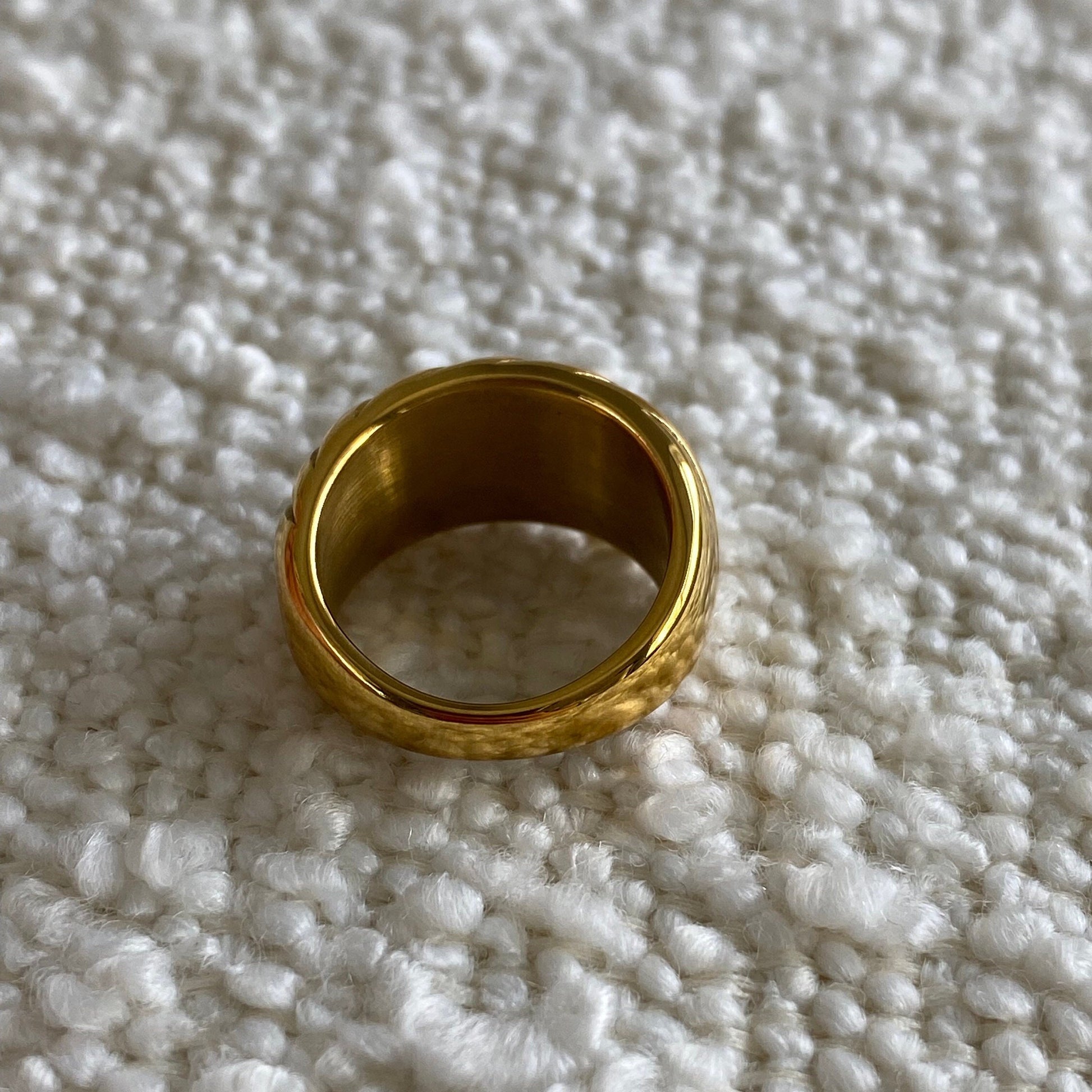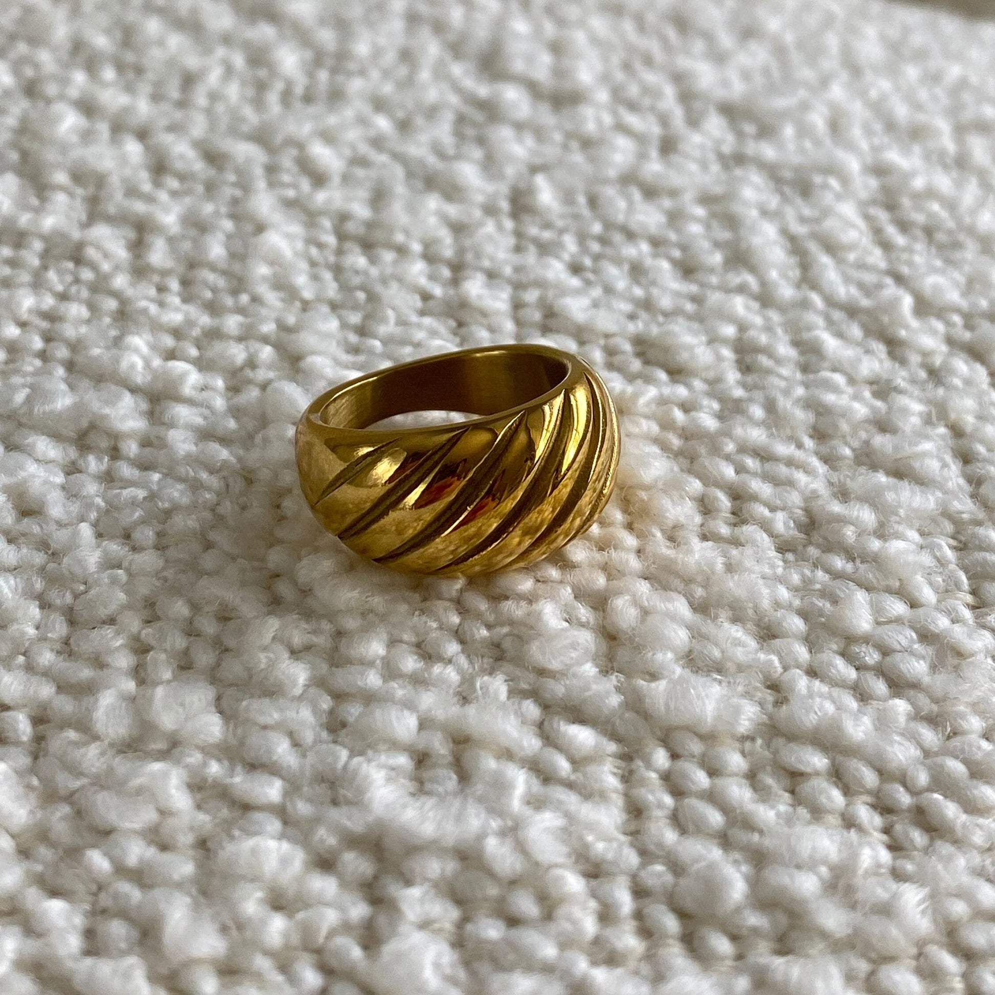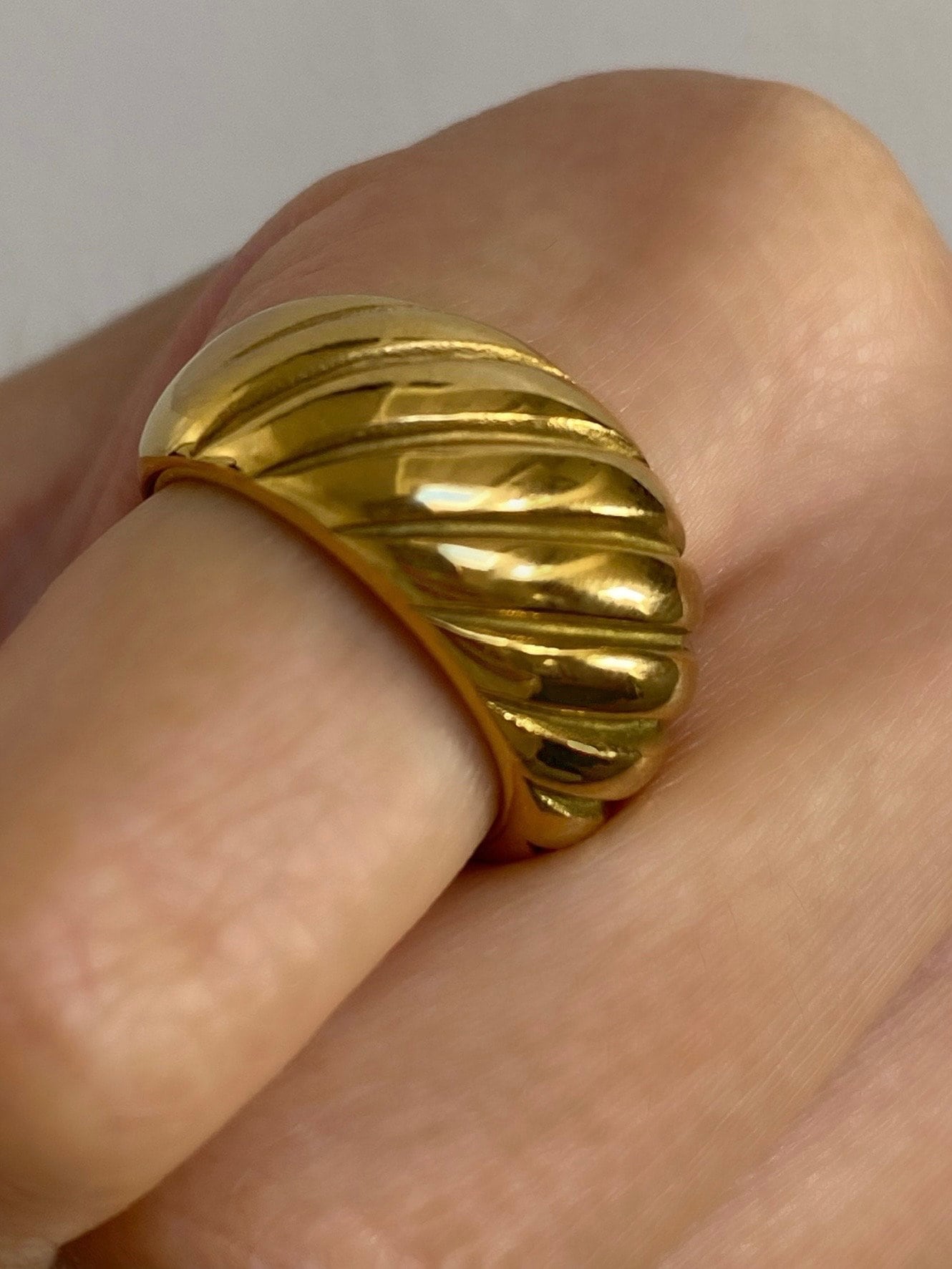 This CHUNKY GOLD CROISSANT RING is made with 18K gold plating and is water-resistant, making it a trendy and durable statement piece. Its signature design allows for easy stacking and makes a great gift for any fashion-forward individual.