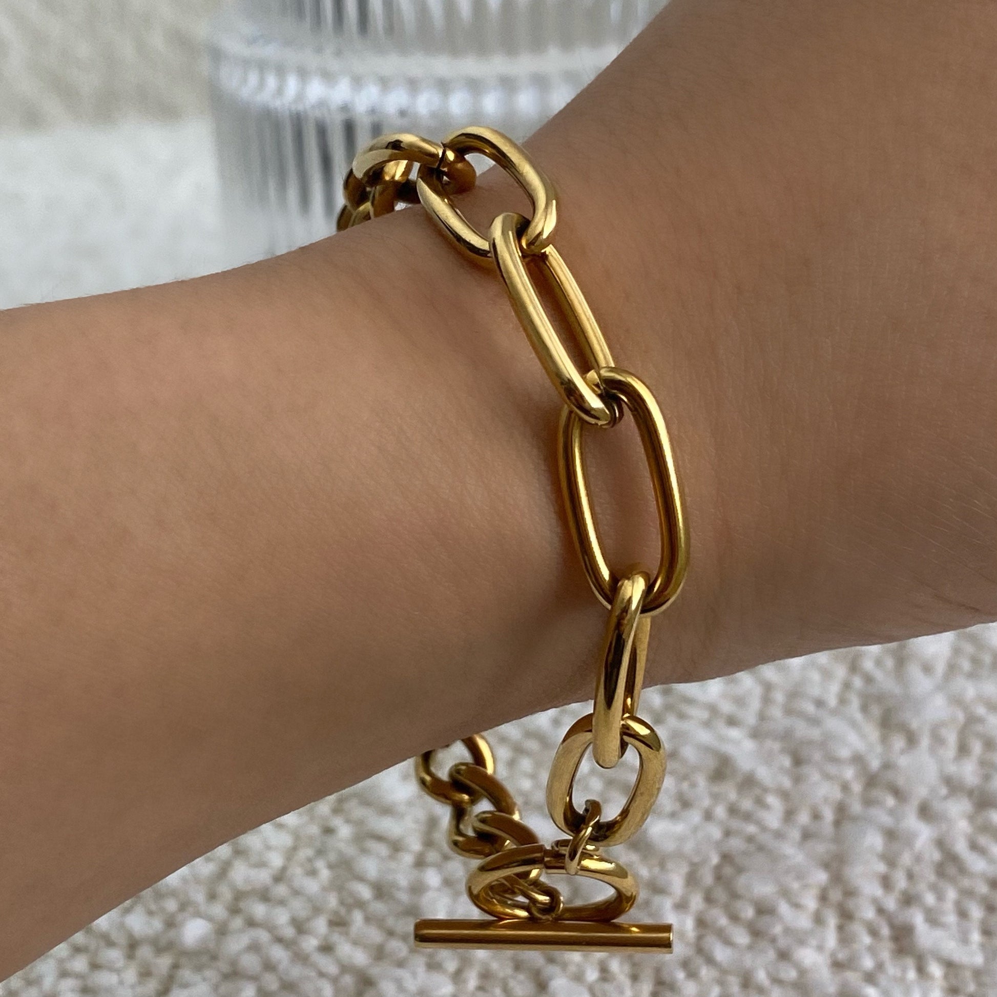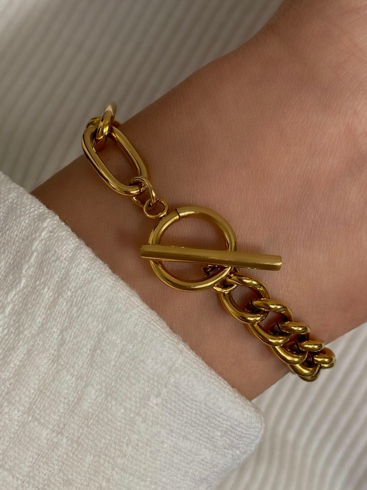 This stylish bracelet features two different link chain designs combined into one modern, chunky statement piece. The bracelet is made of 18K gold filled stainless steel and is waterproof for everyday wear. It comes in one size and includes an 8mm paperclip chain.